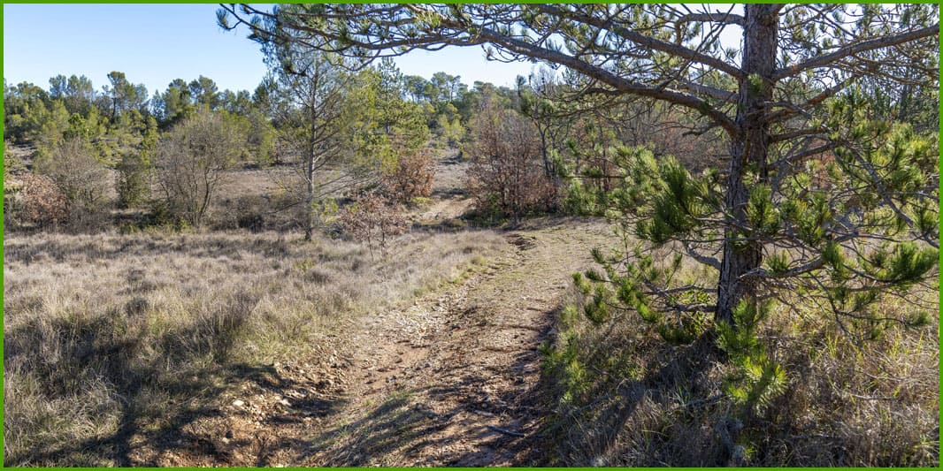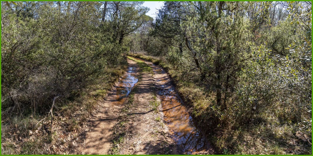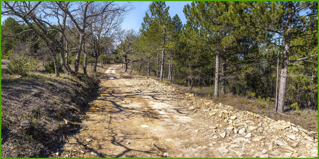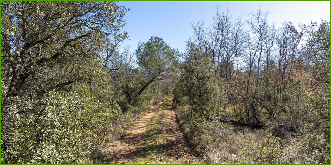 En sortant du Domaine du Puits, prendre un chemin orienté plein Nord. Après 200 m vous arrivez sur un carrefour de piste, Prendre celle de droite qui s’oriente plein Est. A partir de là, vous allez marcher sur des pistes de terre rouge. Traverser des zones colonisées essentiellement de chênes verts, chênes pubescents, genévriers, quelques pins isolés et une garigue qui occupe les espaces libres. Les ornières creusées sur la piste sont par moment remplies d’eau en ce mois de Mars. Vous devrez marcher 1 km, en prenant systématiquement à chaque carrefour, la piste de gauche avant de rejoindre le GR99.