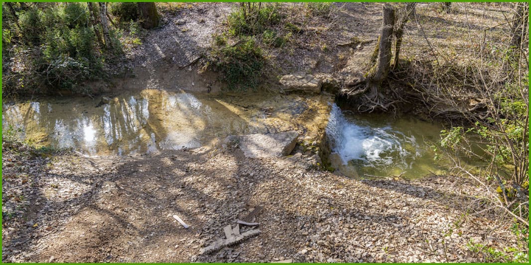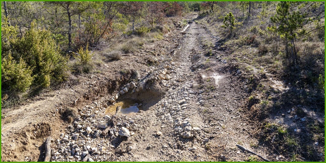 En sortant sur le GR99 a, vous arrivez sur un carrefour de piste. Celle de gauche sera celle du retour. Prendre celle de droite, elle s’oriente SE sur le GR99a. Après 1.3 km, quitter le GR pour un chemin qui part à gauche. Cette boucle va revenir après 400 m sur le GR. Mais elle permet de couper un peu la monotonie d’une piste presque rectiligne. Néanmoins elle vous obligera à franchir un passage à gué pas très profond. De retour sur le GR le sol est très raviné. Il a dû subir l’érosion des fortes pluies tombées pendant tout le premier trimestre. Marcher 550 m avant de quitter le GR pour un chemin non balisé à droite. Après 270 m vous arrivez sur un carrefour de pistes. Prendre celle de droite, elle passe à droite d’une grande citerne et après 50 m débouche sur la D470 route de St-Maximin.