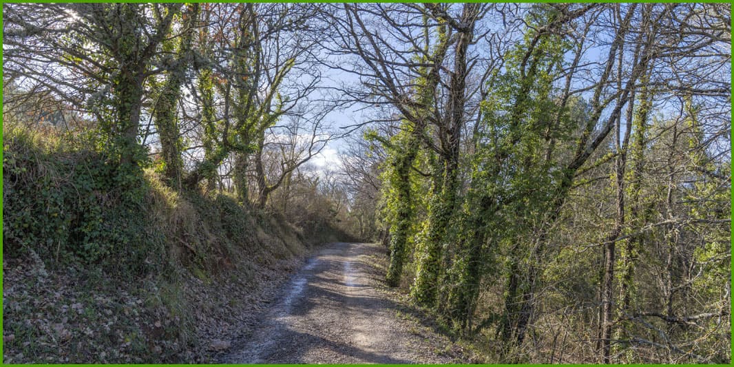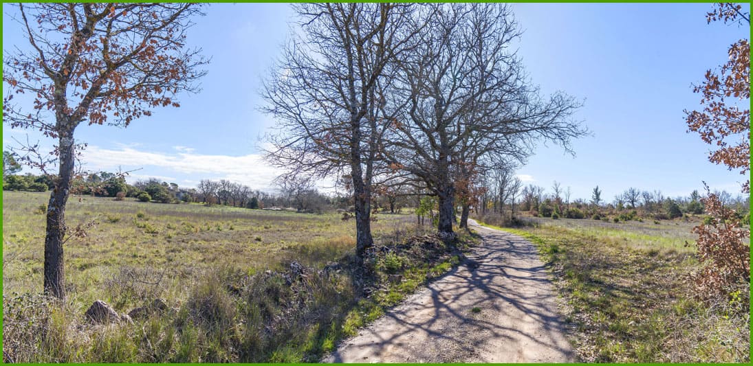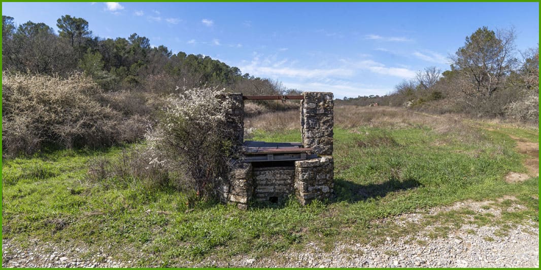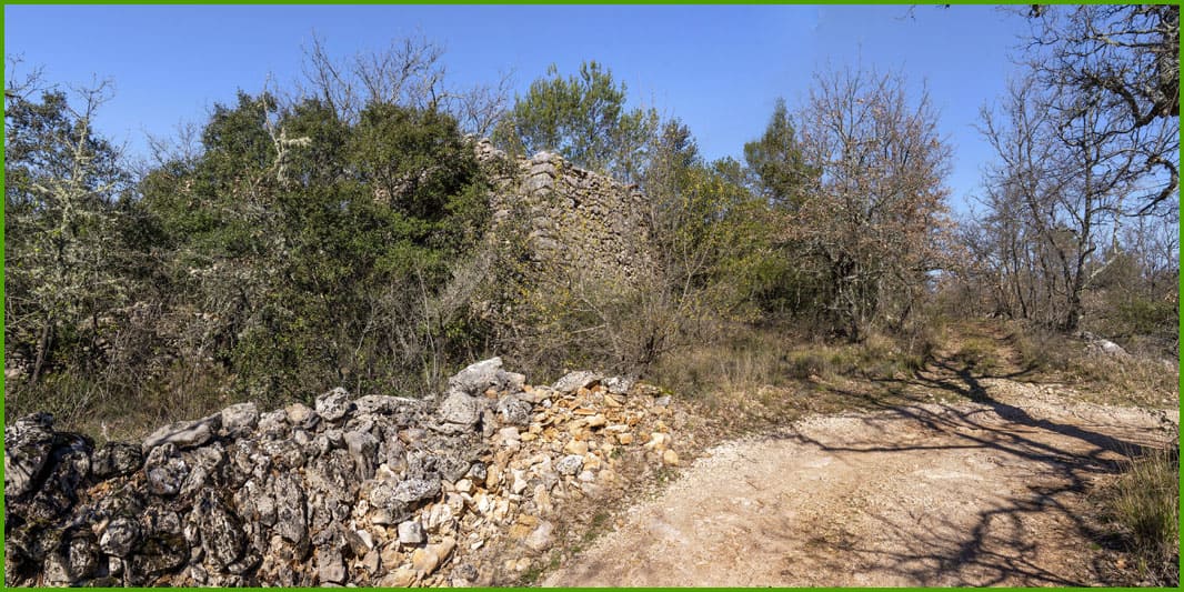 En sortant sur la D470, traverser la route pour un chemin qui part en face plein Sud. Progressivement il se réduit et après 200 m, il sort sur une piste. Prendre à gauche et marcher 40 m avant d’arriver sur un carrefour de chemins. Prendre celui de gauche et marcher 40 m avant de passer devant la grille d’une propriété. Continuer sur la piste qui part en face plein Sud et marcher 430 m avant d’arriver sur un carrefour de pistes. A droite le mur d’une ruine émerge encore d’une végétation qui l’a envahie en partie. Prendre la piste de gauche plein Est. Marcher 550 m avant de rencontrer une route qui arrive à gauche de St-Martin-de-Pallières. Prendre à droite et marcher plein Sud dans une zone dégagée de végétation dense. (Certainement d’anciennes zones de culture). Après 500 m vous arrivez au niveau du Domaine du Puits.
