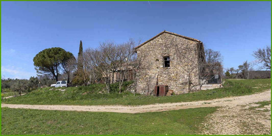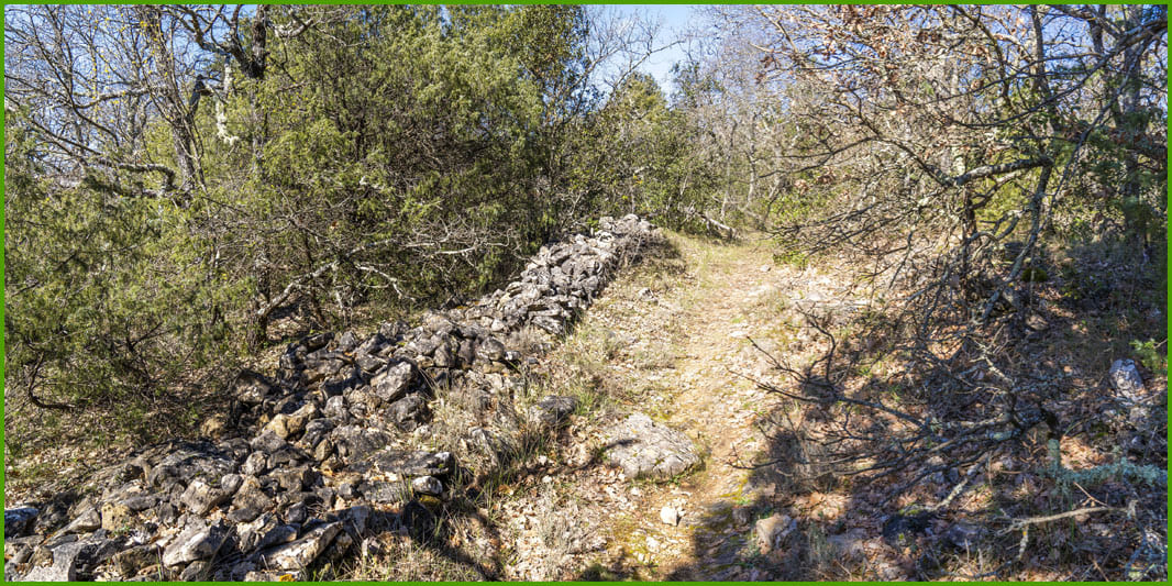 En arrivant sur le GR, prendre à gauche plein Nord. Après 90 m vous arrivez sur un carrefour de piste. Prendre celle qui continue en face sur le GR. De là vous allez parcourir 700 m et gravir 70 m sur un chemin caillouteux avant d’arriver au niveau du hameau de Valensole. Le hameau de Valensole est situé sur un petit mamelon. Il est composé de deux maisons et de leurs annexes. Traverser en restant sur le GR, le chemin redescend presque aussitôt. Passer à la droite d’un vieux puit, marcher 110m avant de quitter la piste pour un petit sentier caillouteux qui monte à droite. Ce sentier est toujours balisé GR99. Après 450 m, vous arrivez sur un plateau. De vieux murs de soutènement effondrés bordent le sentier. Continuer 150 plein Nord avant de sortir sur une large piste.