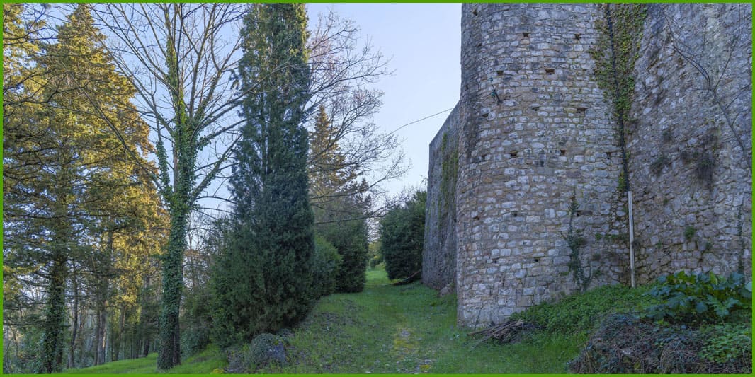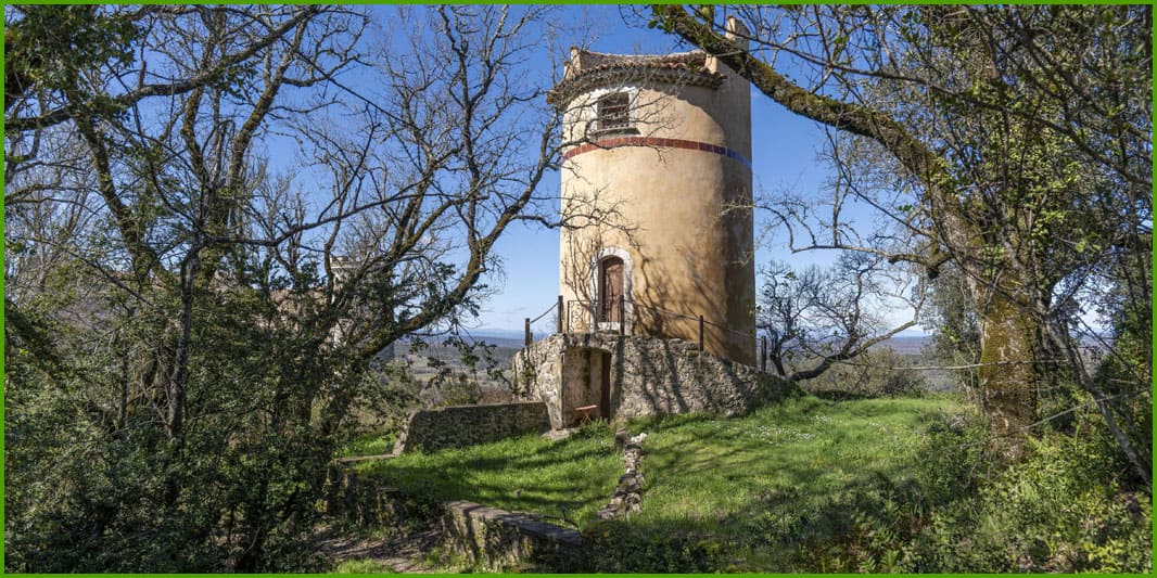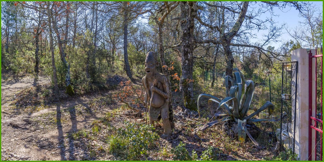 En sortant de la Grotte, partir à gauche et marcher 150 m avant de sortir sur une clairière. C’est aussi un belvédère sur la vallée au Nord et sur les Montagnes au loin. De là plusieurs sentiers partent NO, en parallèles et à des niveaux différents. Ils arrivent tous au niveau des jardins du Château de Saint-Martin. Celui que j’ai choisi est celui de droite qui après 450 m débouche devant le pigeonnier du Château. De là, descendre sur le sentier vers le jardin et en sortir par un portail non fermé sur le GR 99. Prendre à droite pour vous diriger vers Saint Martin-de-Pallières.
