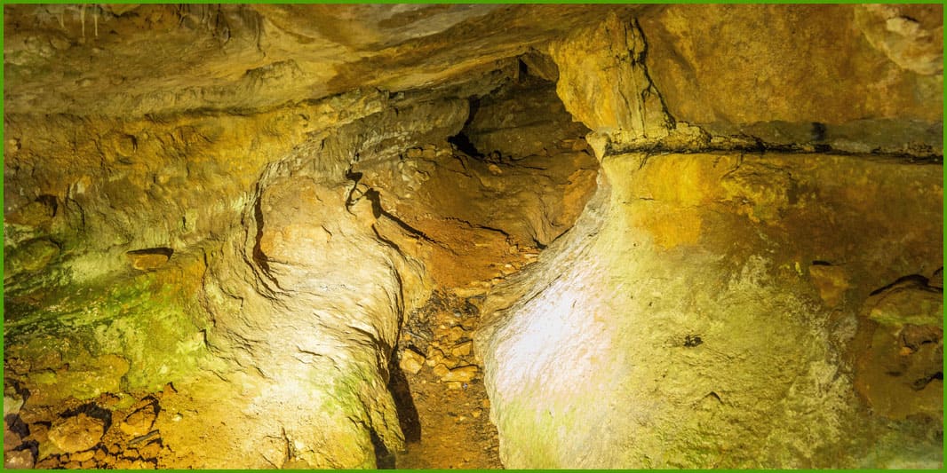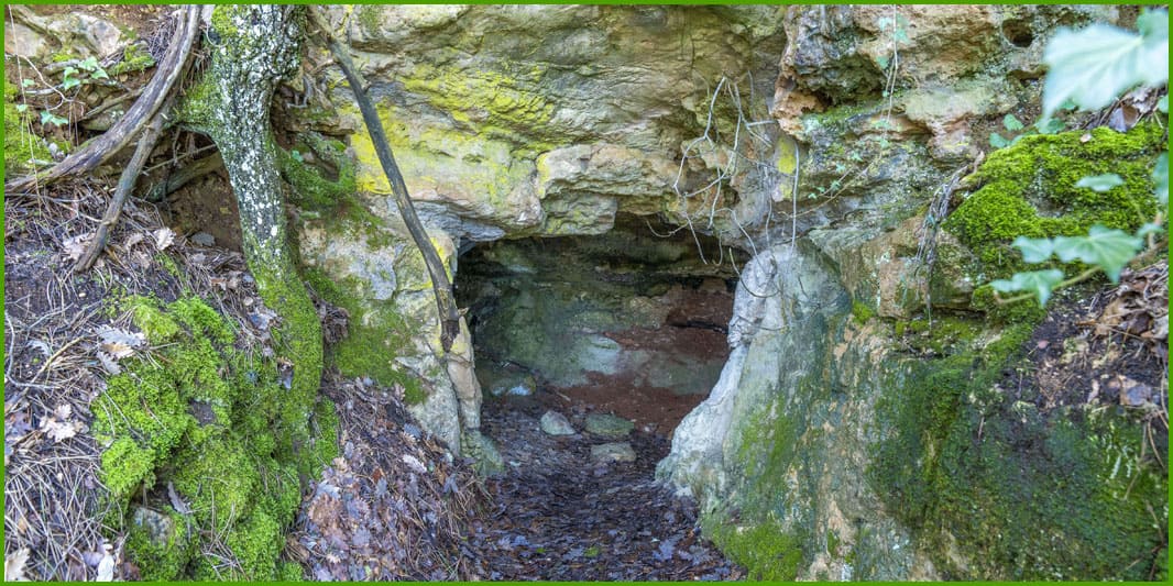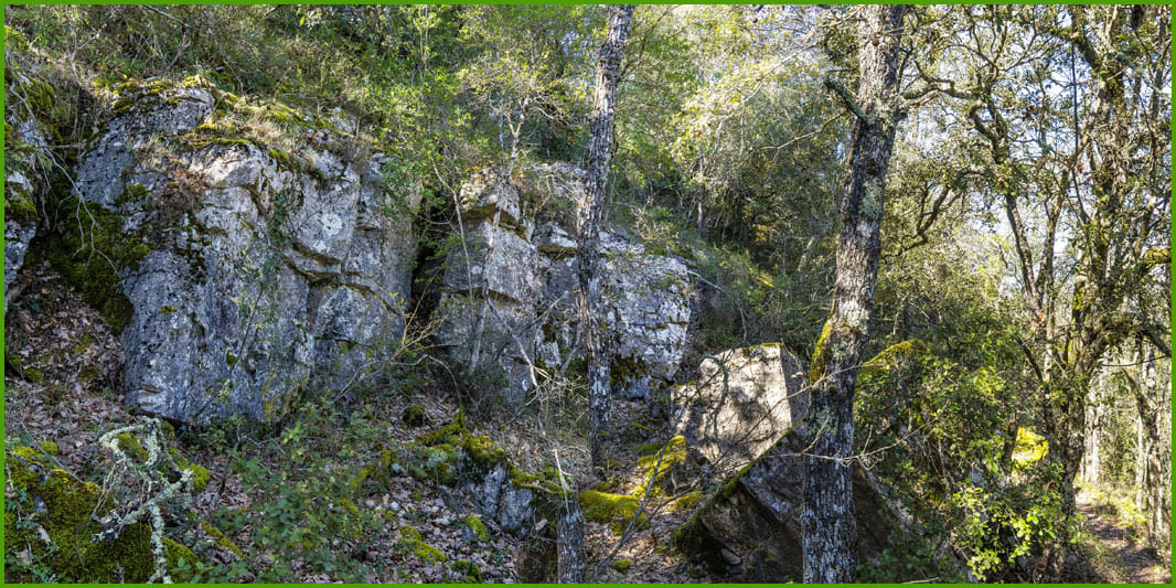 En arrivant sur la large piste, prendre à gauche. vous êtes encore sur le GR99. Marcher 175 m avant de descendre sur un petit chemin à droite. Il progresse en balcon dans un forêt dense. Et après 130 m, passe dans une zone où de gros blocs de rochers se sont effondrés en bord de sentier. Dans ce secteur, le sentier est maintenu par de vieux murs de soutènement à droite. Un peu plus loin, vous arrivez sur un carrefour de sentier. Prendre celui de gauche qui monte légèrement. A nouveau après 110m vous arrivez sur un carrefour de sentier. Prendre celui de gauche qui après 75 m arrive devant l’entrée de la Grotte du Belvédère.