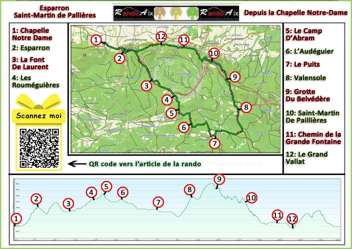 Esparron / saint-Martin de Pallières depuis la Chapelle Notre-Dame est une randonnée de 16 km et 455 m de dénivelé. Son itinéraire en boucle complète, tourne dans le sens antihoraire. Le départ se fait à partir du parking de la Chapelle Notre Dame, situé à gauche de la D 561. L’itinéraire va revenir sur la D561 jusqu’au pied du village d’Esparron. Puis après avoir traversé le village, il va rejoindre le GR 99a, qu’il va suivre SE et sur 2.2 km. qu’il va quitter pour une grande boucle à gauche qui passe par le Domaine du Puits.